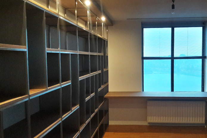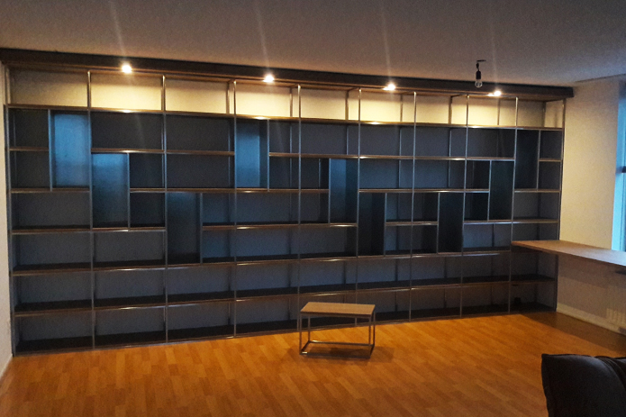 Voor een van onze particuliere klanten mochten wij een stalen boekenkast met bijpassend bureau en krukje ontwerpen, produceren en monteren. Het werd een kast over de totale breedte van dit penthouse op de 9e verdieping.