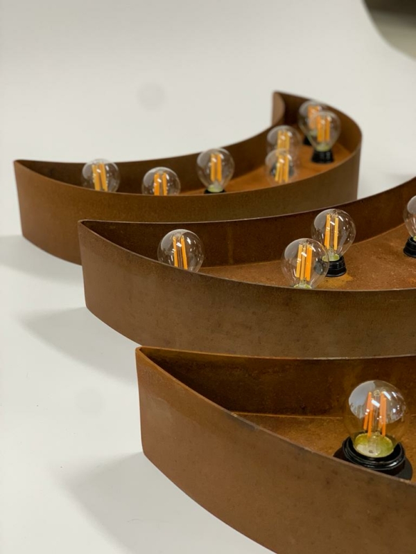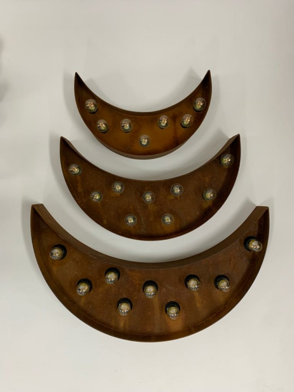 De corten stalen maan met gloeilampen erin is een unieke en opvallende decoratieve verlichtingsoplossing. Deze maanvormige lamp is gemaakt van duurzaam corten staal, dat bekend staat om zijn roestige uitstraling en lange levensduur. De gloeilampen in de maan zijn strategisch geplaatst om een warme, gezellige sfeer te creëren.