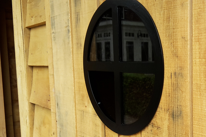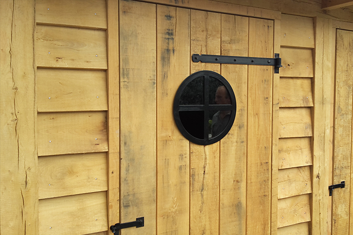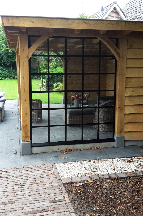 Op deze foto’s ziet u een stalen pui en een bijpassend raampje dat wij geproduceerd en gemonteerd hebben in een prachtig eiken tuinhuis in Barneveld.